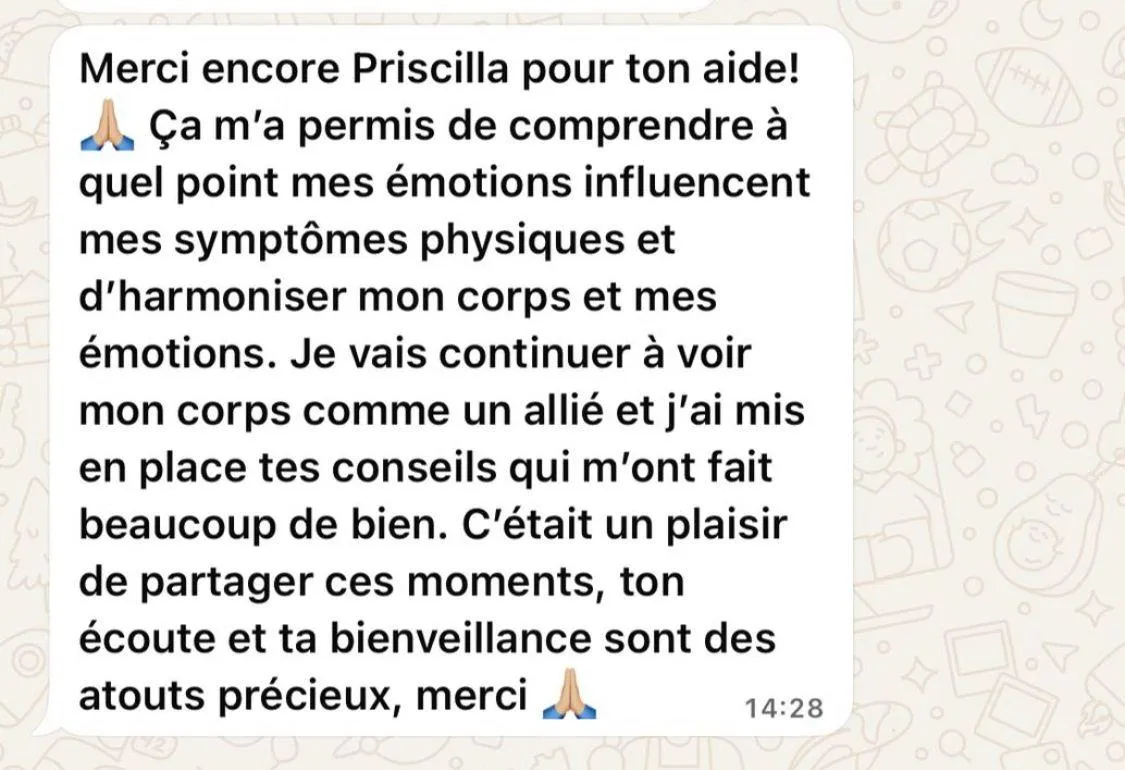 Je m'appelle Priscilla, j'ai 40 ans et j'exerce la naturopathie "holistique" depuis 6 ans et ça fait 15 ans que j'apprends à comprendre mon fonctionnement (physique, mental, émotionnel, énergétique).
